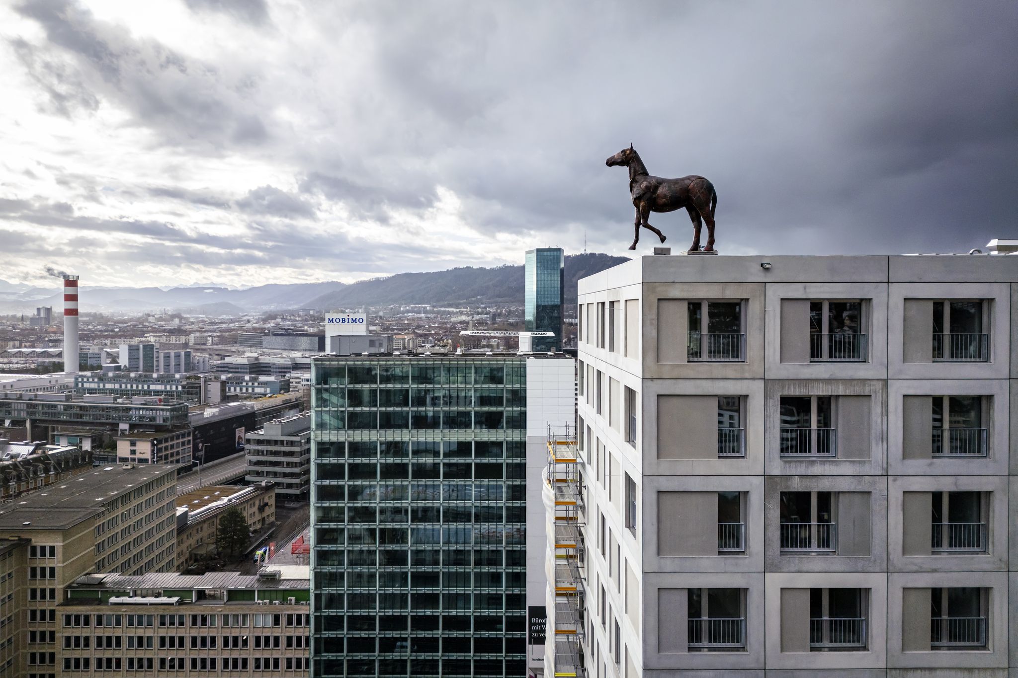 Ein Pferd bäumt sich auf, ausgerechnet auf einem Hochhausdach. In der Stadt Zürich zieht eine neue Skulptur Blicke auf sich. Das Pferd scharrt mit den Hufen. Es bäumt sich sogar auf. Das wäre auch normal für so ein Tier. Allerdings passiert das auf dem Dach eines Hochhauses! So ist das Pferd schon von Weitem zu sehen. Es ist aber eine Skulptur, kein echtes Tier. Die Figur kann sich jedoch bewegen. Das ist mindestens genauso ungewöhnlich wie der Platz, an dem sie steht. Das Hochhaus wurde neu gebaut in der Stadt Zürich, im Land Schweiz. Früher standen auf dem Gelände Hallen für Straßenbahnen. Ganz früher wurden die von Pferden gezogen. Daran erinnert das Pferd auf dem Dach.