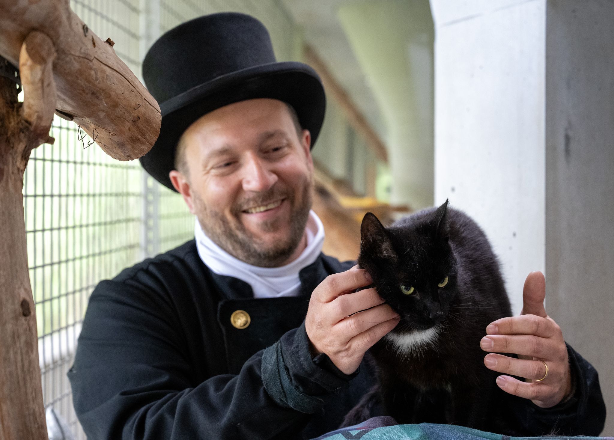 Ein Schornsteinfeger streichelt einen schwarzen Kater.